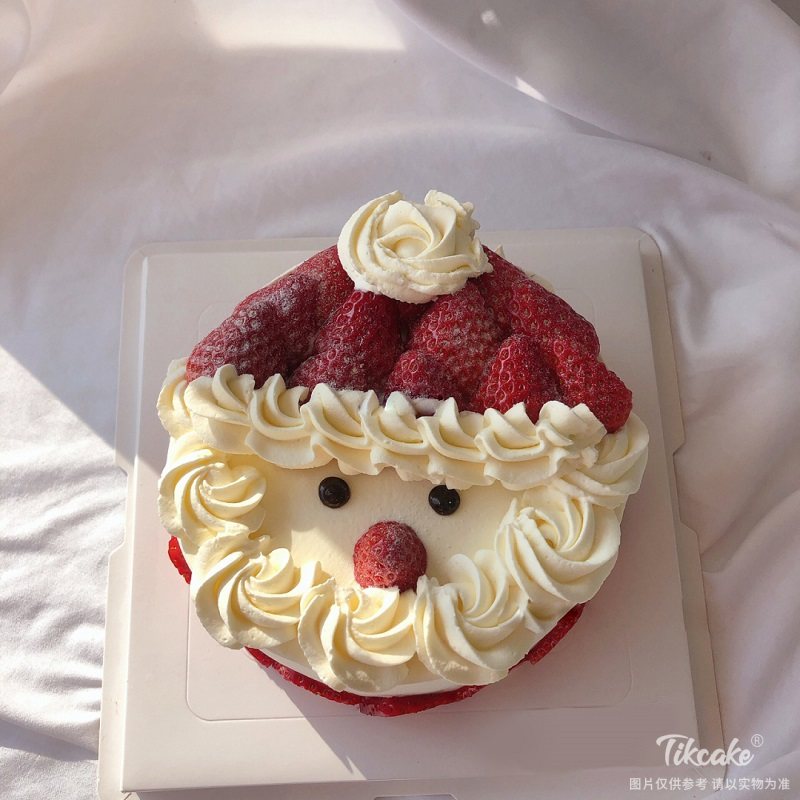 内层蛋糕胚+奶油(含水果果肉)叠层,表层圣诞老人主题草莓,奶油装饰