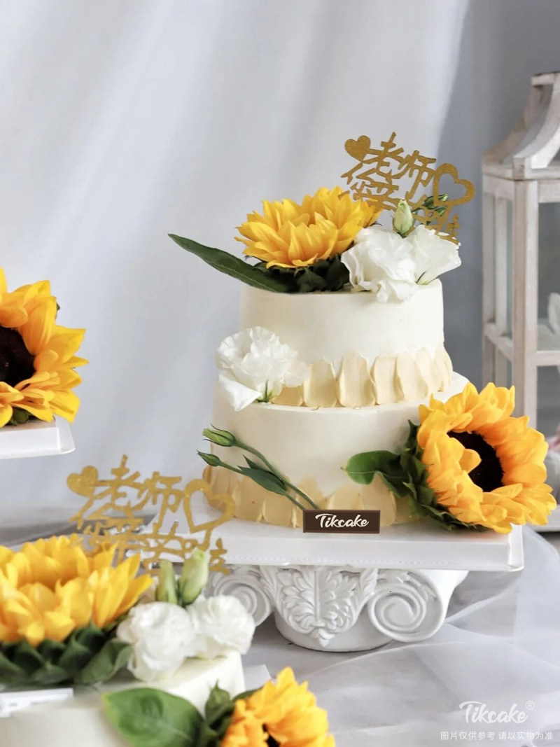 内层蛋糕胚+奶油叠加(含水果填充),表层向日葵鲜花、教师节主题插牌等装饰。